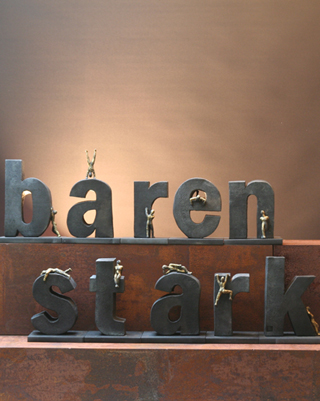 Objekt „bärenstark“ , Schwarzbrand mit goldpatinierten Figuren, 160cmx24cm. |