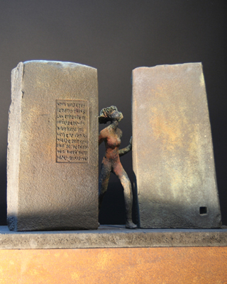 Schrifttafeln mit Figur, Hochbrand, patiniert, 50x38cm