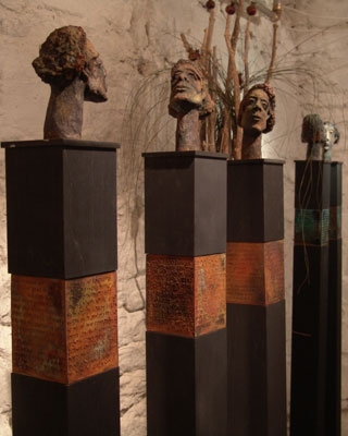 Geschichtenerzählerinnen sind bei der Arbeit zum Projekt Grenzland entstanden. Es sind Birkensäulen, 170cm hoch, ihre Köpfe und die keramischen Platten sind Raku gebrannt und nachbehandelt. Sie erzählen die Geschichten über das Grenzland, jenen Streifen zwischen Festland und offener Meeresweite, über feste Wurzeln und losgelöste Leichtigkeit und darüber, dass wir öfter mal die Leinen losmachen und Segel setzen sollten - |