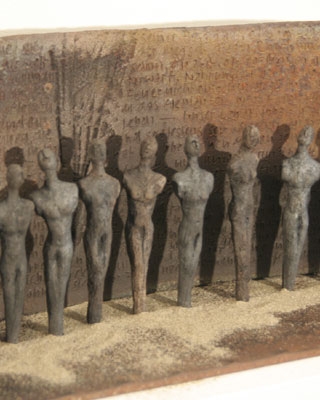 Reflexionen zum Elementaren, war unser Thema im Jahr 2006. Ein Thema, das sozusagen unser ständiger Begleiter ist: Die Elemente Erde, Feuer, Wasser und Luft sind in unserem Schaffen unsere Verbündeten und Lehrmeister. Sie fordern von uns Wissen und Können und Respekt in gleichem Masse. Die keramische Wand, 50/23cm, mit nachdenklichen Figuren, die über Elementares sinnieren. Das Objekt ist Raku gebrannt und nachbehandelt. |