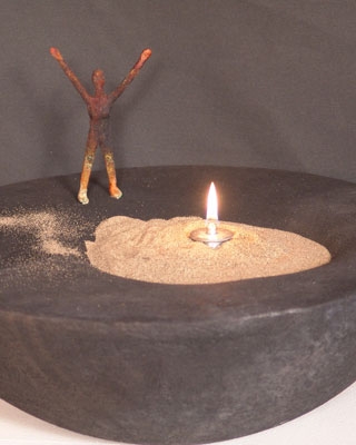 Halbkugelige Schale mit einer Figur; beides Raku gebrannt und teilweise nachbehandelt.