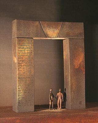 Torobjekt Liebe, 40cm hoch, Hochbrand 1200°, mit zwei Figuren, Bronze patiniert. |