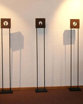 Drei Eisenständer, 160cm hoch, mit verschiedenen keramischen Figuren. |