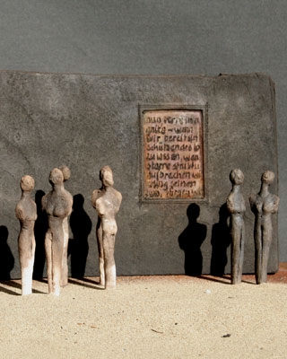 Keramikwand mit stehendenFiguren, geräuchert. Gesamtbreite 48cm